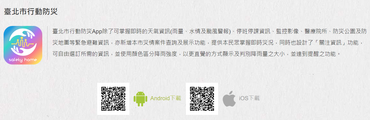 臺北市行動防災App更版版本可於Play商店(Android)、 App Store(iOS)或下載連結:https://reurl.cc/blAvOE 進行下載。