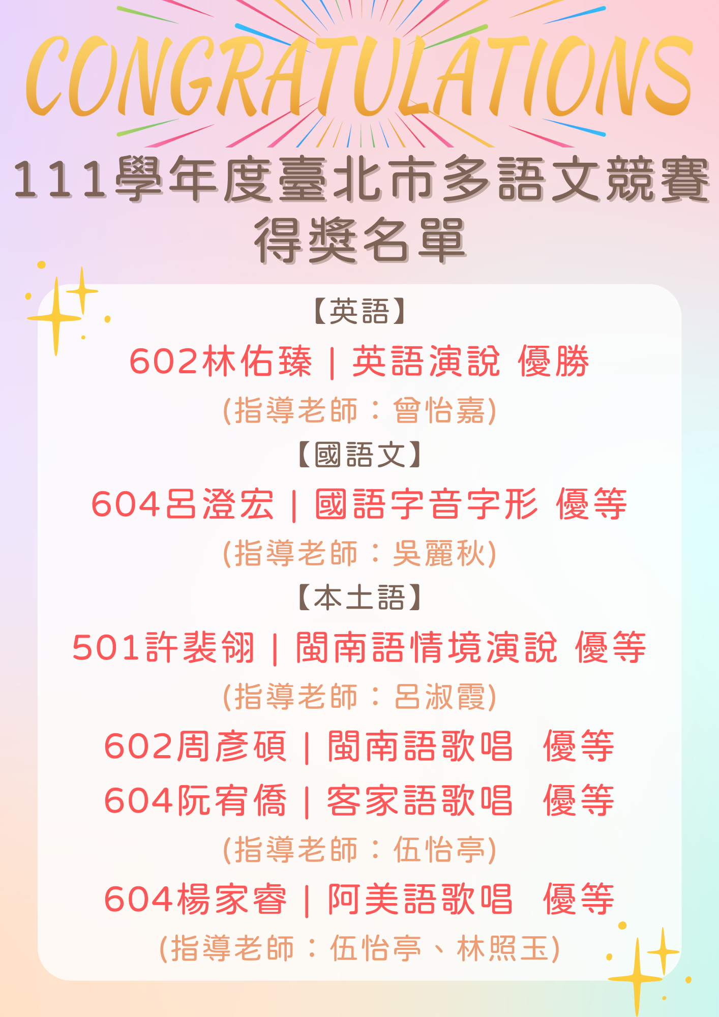 恭喜所有得獎的同學們, 感謝所有參賽同學的努力, 同時感謝各位指導老師的辛勤教導!