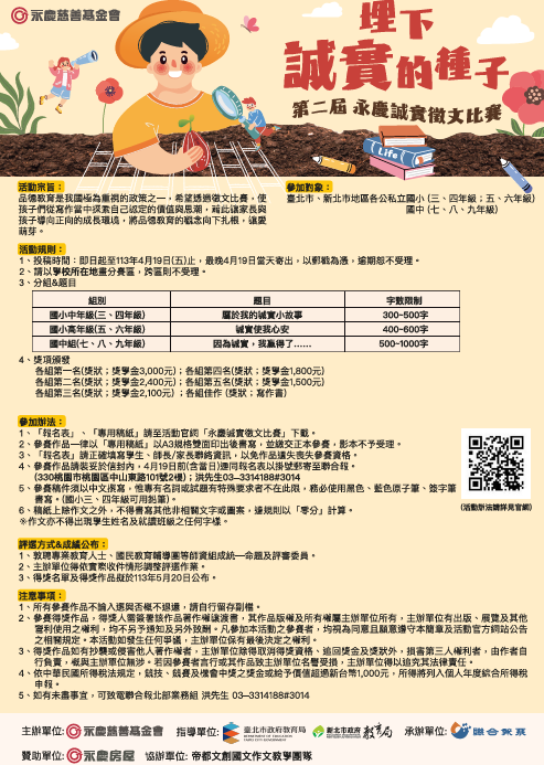 「第二屆永慶誠實徵文比賽」-為透過徵文活動,培養學生對於生活的觀察力,並 從寫作中探索自我價值與思潮,讓品格教育的觀念向下扎 根,以「埋下誠實的種子」為主題,希望學生從將品格素 養融入文字的過程中,亦將優良德行落實於日常生活、徵 文活動內容摘要如下: